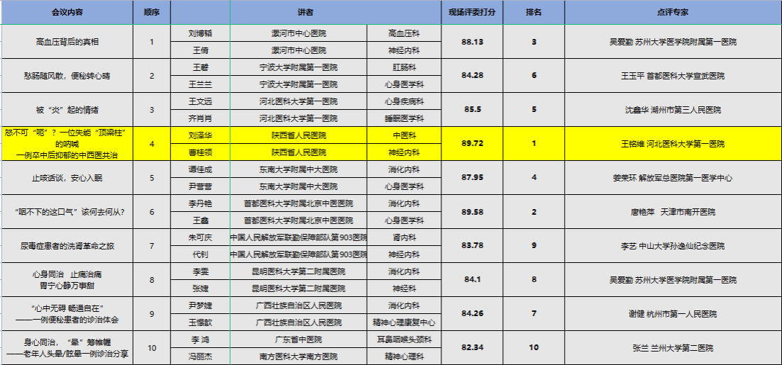 此次全国病例演讲大赛由中华医学会心身医学分会主办,中华医学会心身医学分会主任委员东南大学附属中大医院袁勇贵教授、中华医学会心身医学分会原主任委员苏州大学附属第一医院吴爱勤教授担任大会主席。首都医科大学宣武医院王玉平教授、湖州市第三人民医院沈鑫华教授、河北医科大学第一医院王铭维教授、解放军总医院第一医学中心姜荣环教授、天津市南开医院唐艳萍教授、杭州市第一人民医院谢健教授、兰州大学第二医院张兰教授、中山大学孙逸仙纪念医院李艺教授等医院的十位专家担任大赛评委。历经6个月,全国20多个省市数百位医生参与分享优秀病例,经过区域赛、各专业全国决赛的角逐,最终,来自首都医科大学附属北京中医医院、中国人民解放军联勤保障部队第903医院、东南大学附属中大医院、河北医科大学第一医院、广东省中医院、南方医科大学南方医院、宁波大学附属第一医院、昆明医科大学第二附属医院、广西壮族自治区人民医院、漯河市中心医院等国内知名医院的10组选手在全国决赛竞展风采。