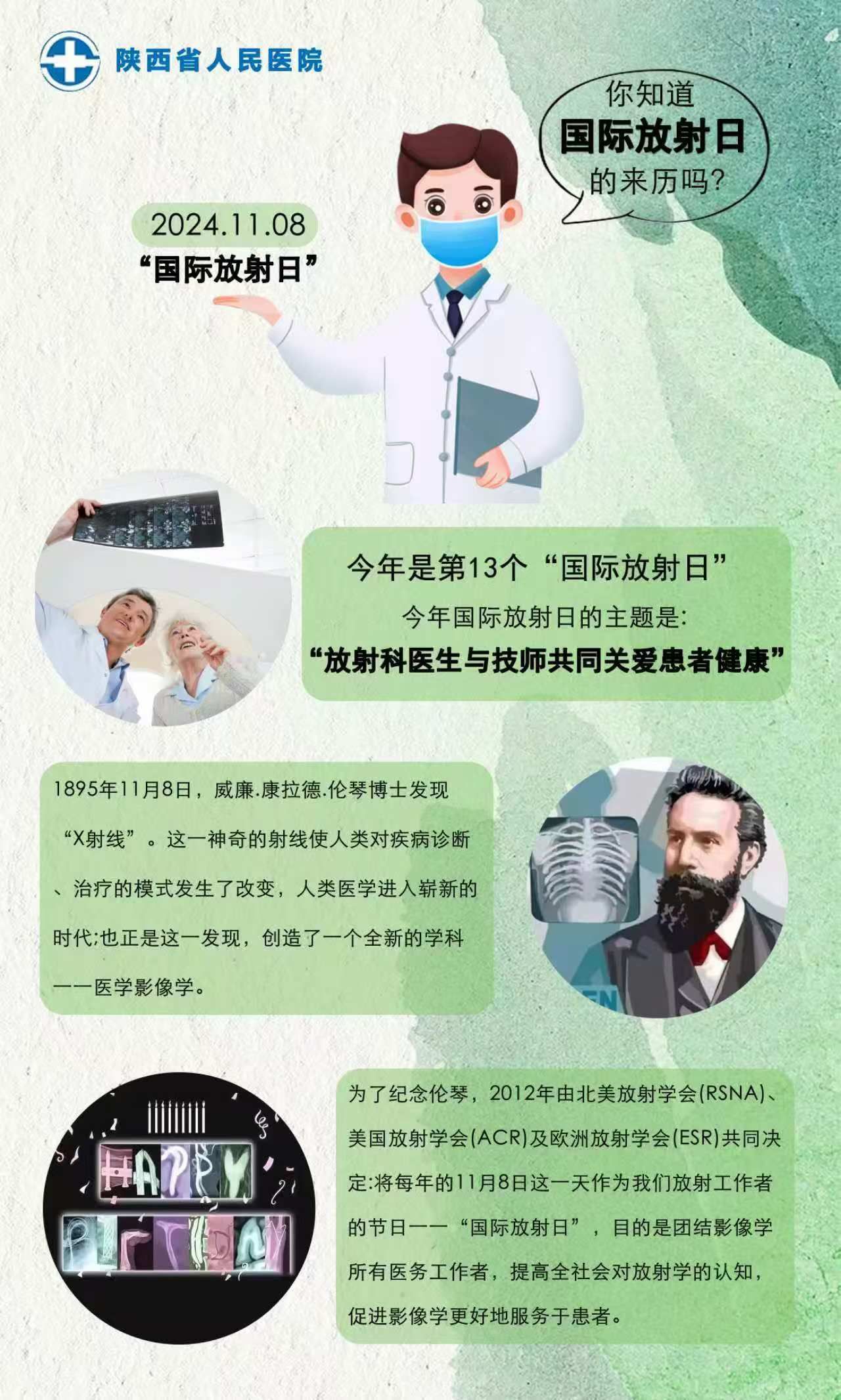 1895年,德国物理学家威廉·康拉德·伦琴博士发现“X射线”,这一神奇的射线使人类对疾病的诊断、治疗的模式发生了翻天地覆的变化,人类医学史也从此进入了崭新的时代,也正是这一发现,创造了一个全新的学科—医学影像学。为了纪念伦琴,2012年,北美放射学会(RSNA)、美国放射学会(ACR)及欧洲放射学会(ESR)共同决定将每年的11月8日作为放射工作者的节日——“国际放射日”。2024年11月8日是第13届“国际放射日”,主题是“放射医生与放射技师共同关爱患者健康”。为了庆祝这一届国际放射日,也为了使患者更了解医学影像科室的相关工作,欧美视频