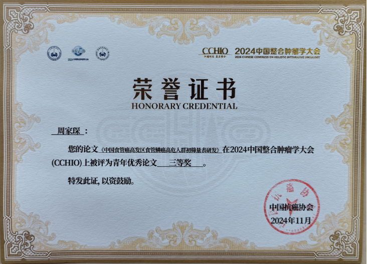 大数据中心周家琛博士的论文《中国食管癌高发区食管鳞癌高危人群初筛量表研发》荣获三等奖,并进行了主题汇报。