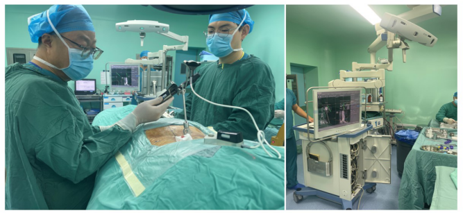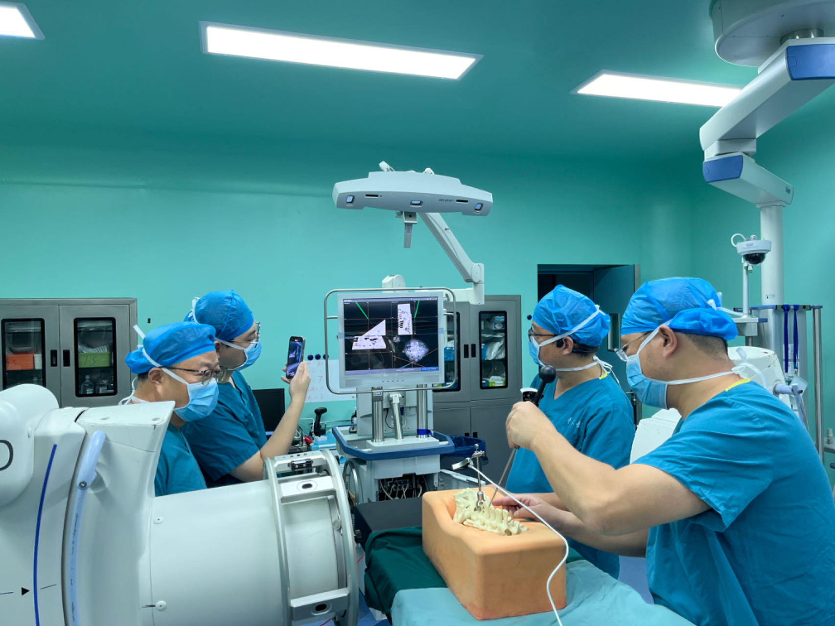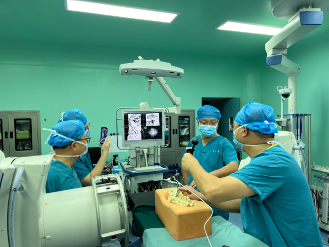 此例手术借助的机器人导航系统由控制系统、定位导航系统、机械臂装置和工具集四大模块组成,四大模块各司其职,环环相扣,共同构建起了一个数字化、智能化、精准化、可控化的手术操作平台。该系统应用广泛,可针对脊柱、关节以及创伤手术进行精准导航,从术前规划、手术通道到图像采集与处理,再到术中定位与导航,以及术者直接干预手术视野,每一个细节都彰显着数字化与精准化的力量。为使得科室医师更加熟练地掌握手术机器人导航系统,骨科前期进行了一系列规范化的操作培训,全面、深入地学习了机器人导航系统的整体构造。青年医生、进修医生以及规培医生以分小组的形式,以3D打印的人体脊柱模型为模拟标本,多次进行模拟演练,掌握了机器人导航系统的使用要求及技术要点。