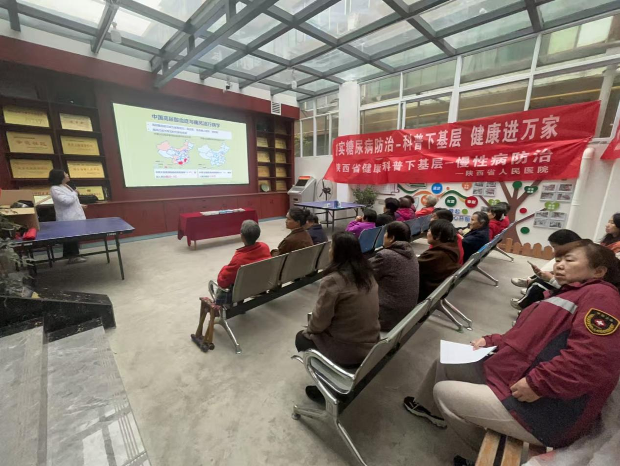 为了进一步提高居民群众对慢性病的防治、健康生活方式的认识,落实省卫生健康委、省乡村振兴局《陕西省脱贫地区健康促进行动方案(2022-2025年)》《陕西省2024年健康素养促进项目工作方案》的要求,由省卫健委主办,在省健康教育中心技术指导下,在李小凤主任的带领下,内分泌科继续进行“2024年度健康科普下基层—健康科普配送服务项目”中的“慢性病防治:夯实糖尿病防治-科普下基层,健康进万家”配送服务。11-12月期间先后6次分别在铜川市耀州区董家河镇孝义社区、潼关县城关街道办事处、宝鸡市凤县县医院、洛川县体育馆、榆林市横山区仓库湾社区及官元峁社区、清涧县上七里湾社区开展系列健康科普下基层讲座及义诊活动。