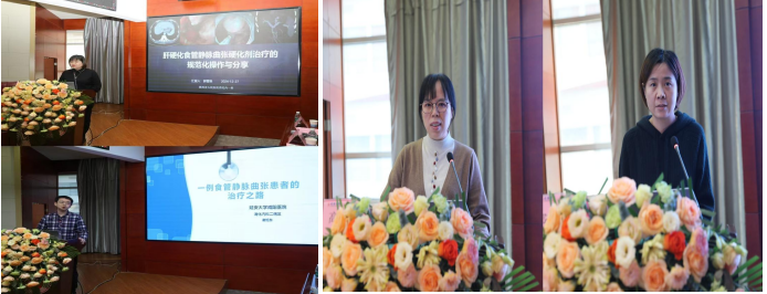 消化内一科刘贵生主任、王萍及郭雪艳副主任、高淑娟副主任医师、陈喆护士长以及延安大学咸阳医院谢旭东主治医师就肝硬化食管胃静脉曲张的急诊内镜治疗策略、组织胶治疗肝硬化食管胃静脉曲张的规范化应用、肝硬化食管静脉曲张硬化剂治疗的规范化操作与分享、肝硬化食管胃静脉曲张急性出血内镜治疗典型病例分享、医护一体化在一例食管胃静脉曲张破裂大出血患者中的急救管理、一例食管静脉曲张患者的治疗之路等内容进行了深入讲解和交流。刘贵生主任、王萍及郭雪艳副主任分别进行了肝硬化食管胃静脉曲张破裂出血及内痔内镜下治疗操作演示及教学。在讨论环节中,参会人员积极互动,就临床实践中的问题和经验进行了热烈的交流。