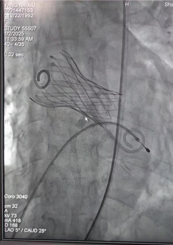 1月2日,新年的第一个工作日,在科室精心准备及心内一科王军奎主任团队的支持下,经导管主动脉瓣置换术(TAVR)手术顺利开台。接受手术的是一位来自宝鸡市岐山县的72岁老年女性患者,患者近2年来反复胸闷气短,备受疾病困扰,心脏彩色多普勒超声提示主动脉瓣重度狭窄,最大跨瓣压差达137mmHg,瓣上最大血流速度585cm/s。姜馨主任主持多学科讨论,审慎评估病情,确定为患者行TAVR手术的治疗方案。经积极准备,张炜副主任医师带领心内三科TAVR团队与心内一科潘硕博士团队密切合作,顺利完成手术。患者术后胸闷气短症状明显好转,复查心脏超声显示主动脉瓣人工瓣膜固定良好,最大跨瓣压差17mmHg,瓣上血流速度基本正常。患者术后恢复良好,已顺利出院。