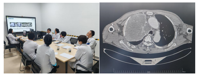会上,周聪雅医师进行病历资料汇报,于娇副主任对患者目前情况进行补充。王青主任医师指出该患者系肺恶性肿瘤终末期,上腔静脉综合征诊断明确,病灶侵犯上腔静脉及头臂静脉末端,出现大面积肺栓塞以及大血管破裂引起的内脏大出血风险和死亡风险极高。考虑到该危重患者治疗上的特殊性,专家们从各专业不同角度仔细、全面地进行了分析讨论。最后王青主任总结讨论意见,确定MDT治疗方案,并将及时为患者进行治疗。