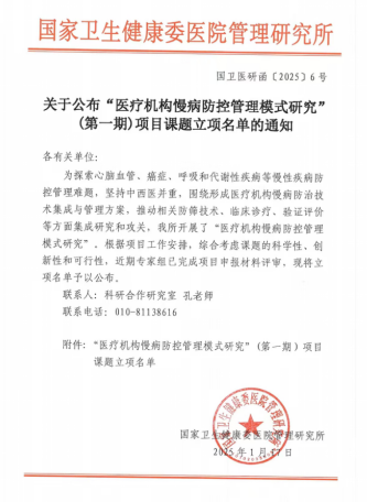 近日,国家卫生健康委医院管理研究所正式公布了“医疗机构慢病防控管理模式研究”重点项目立项名单。在医院及学科办指导下,在科室团队的支持下,欧美视频