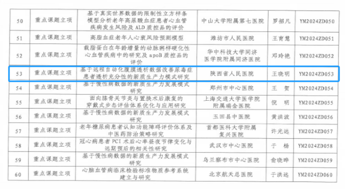 肾脏血透中心王晓明主任医师团队申报的《基于远程自动化腹膜透析数据改善尿毒症患者透析充分性的新质生产力模式研究》课题(项目编号:YM2024ZD053),成功获批“医疗机构慢病防控管理模式研究”重点课题项目。