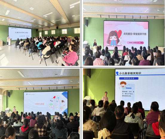 4月2日下午,儿童病院党支部“创辉”党员突击队队长郑千千副护士长带领党员卫丽副主任医师、程瑞推拿师走进幼儿园,为老师和家长们带来了一场生动有趣的健康科普讲座。卫丽副主任医师以《点亮星空——早发现早干预》为主题,凭借丰富的专业知识和临床经验,为家长们揭示了孩子成长中的奥秘,并引导他们如何更早地发现并干预孩子的成长问题。郑千千副护士长分享了《膳食营养对神经发育的影响》,从专业角度出发,讲解了如何科学合理地管理孩子的饮食,让孩子的身体更加健康茁壮。此外,程瑞推拿师还带来了《小儿推拿在家庭中的应用》的精彩分享及实操演示,她用简单易懂的语言,教会了家长们如何在家庭中运用小儿推拿,助力孩子茁壮成长。