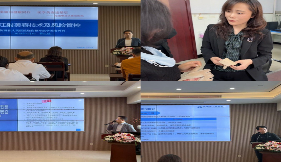 4月10日,慕生枝主任率队赴鄠邑区惠安医院,开展“技术赋能+健康普惠”活动。学术交流环节中,慕生枝主任以《注射美容技术风险全流程管理》为题,拆解临床操作核心要点;高文杰主治医师聚焦《2025医美新风向与科学养肤》,揭秘行业前沿趋势;伍航利主治医师针对《糖尿病足溃疡综合治疗策略》展开深度解读,为基层诊疗提供系统化解决方案。义诊现场同步升温,专家团队为多名群众提供“一对一”精准服务:从面部年轻化方案定制到顽固性皮肤问题诊疗,从个性化瘢痕修复到居家护理指导,以“三甲标准”回应民生关切。朱秀梅护士长通过一例复杂瘢痕修复案例,展现“技术+温度”的护理理念,患者感动坦言:“这样的专业和关怀,让我们对康复充满信心!”惠安医院李永魁主任评价:“活动架起了优质资源直达基层的桥梁,既惠民又强医。”