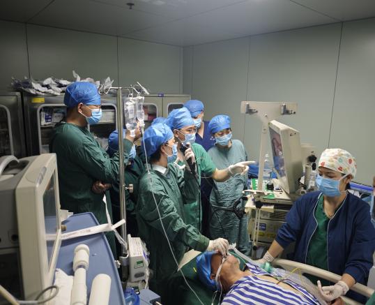 由于患者存在巨大气管瘘,全麻风险极高,全麻下正压通气过程中可能引起纵隔气肿,继而发生循环障碍,高频通气可能引起消化道过度充气,导致患者氧合下降等不良后果。为保证病人安全及手术顺利进行,麻醉科王晖副主任及岳芳麻醉团队通过研判,充分评估患者病情,制定了不插管状态下镇静麻醉办法,为支架植入赢得了宝贵的治疗机会。通过各团队的通力合作及精湛的操作技术加持下,手术顺利进行,为患者植入了金属覆膜支架,解决了气道狭窄及气管瘘问题。术后患者病情平稳,呼吸困难、气喘症状得到明显缓解。