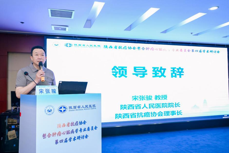 宋张骏院长致辞,他对整合肿瘤心脏病学专业委员会的工作表示充分肯定,希望专委会能够继续借助陕西省抗癌协会平台,以陕西省肿瘤心脏病专科联盟的成立为契机,加强与各级医院的合作,凝聚省内同行的智慧与力量,推进学术交流,加强业务学习,勇于临床实践,扩大科普宣传,开展相关基础及临床研究,推动肿瘤心脏病防治队伍的建设,促进我省肿瘤心脏病学科的发展,为三秦大地乃至广大西北地区肿瘤患者保驾护航。