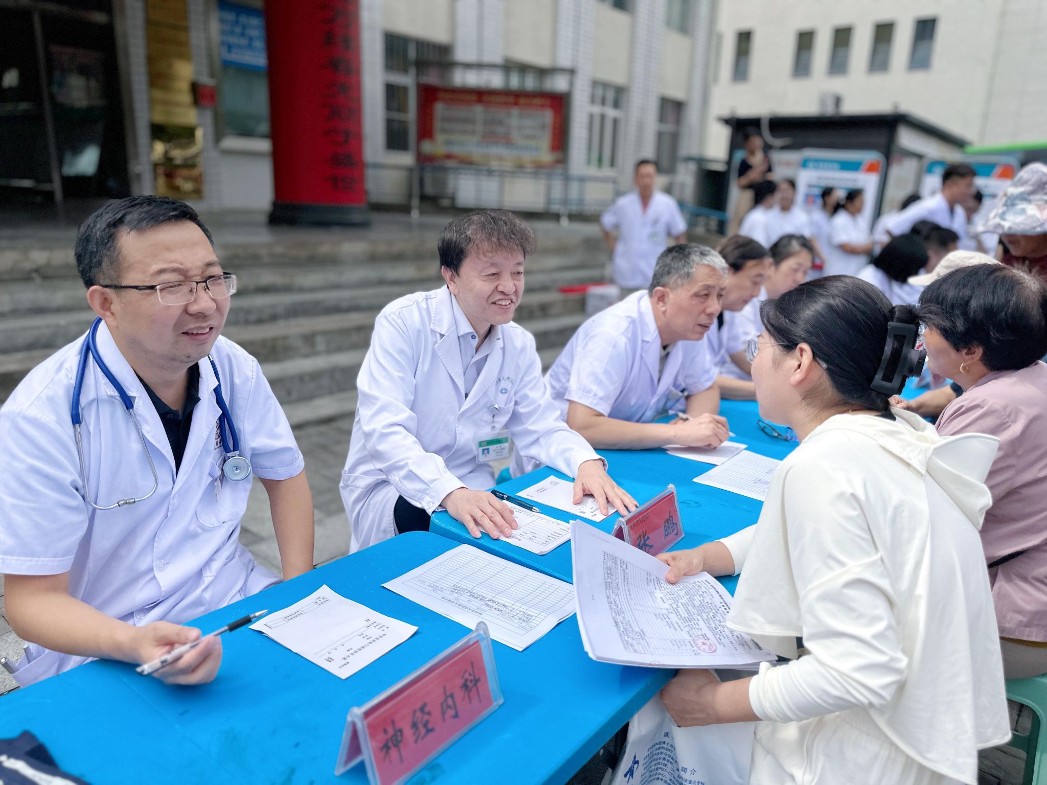 在旬阳县人民医院,四十余名党员医护人员身着白大褂,佩戴党徽早早来到义诊现场,面对前来的群众认真倾听、仔细问诊、耐心答疑,将专业的疾病预治、慢病管理及科学规范用药等知识传递给现场群众。一次次细致的解释、一句句暖心的话语,饱含了党员医务工作者诚挚的初心。
