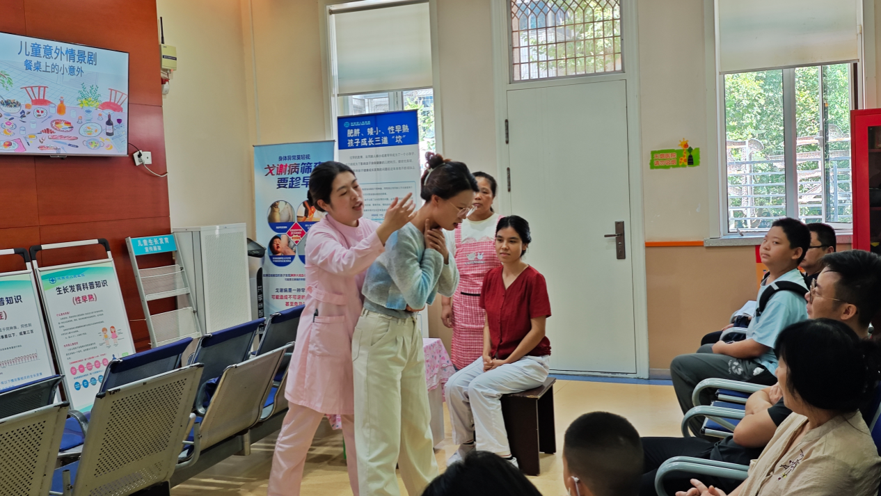 活动精心组织了“儿童气道异物情景剧”,以真人演示、分步讲解、互动实操的形式,向广大家长科普了海姆立克法等日常基本急救技能,并针对日常生活中常见的儿童意外伤害预防措施和规范处置流程进行了现场教学。