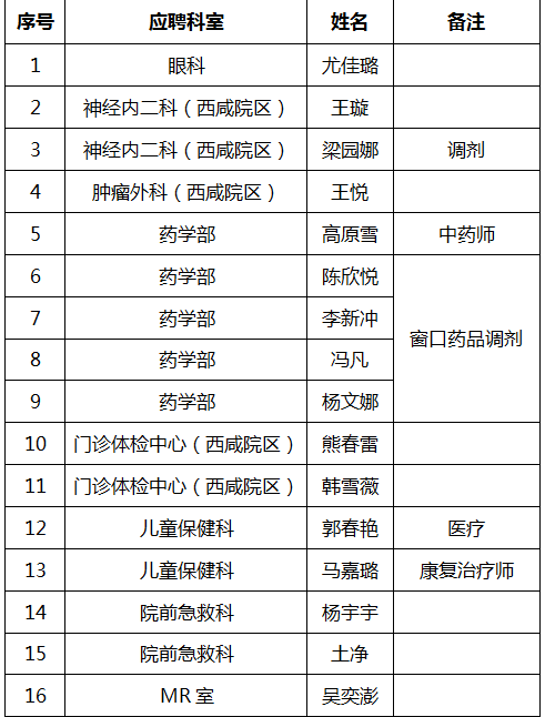 根据欧美视频 《关于招聘合同制临床医技类岗位工作人员公告》,在纪检监察处的全程监督下,经岗位公布、报名登记、资格初审、笔试、面试等程序,拟聘用尤佳璐等33人到欧美视频 工作,现将结果予以公示。