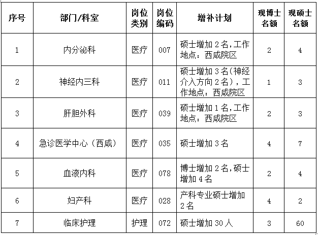 根据医院学科建设和业务发展需要,经医院研究决定,在2023年12月13日发布的《欧美视频 2024年博硕士及高层次人才招聘公告》基础上,增加博硕士招聘岗位人数47名,其中招聘医疗岗位博硕士17名,护理岗位硕士30名。其他事宜与原公告保持不变,特此公告。增加岗位计划数详见附件。