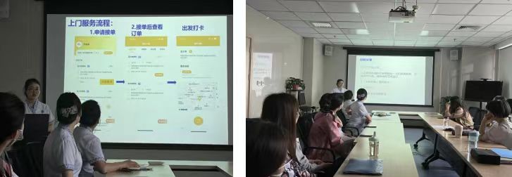 护士千珊珊主持会议,就此次会议的目的及目标进行了概述。“互联网+护理服务”以“线上申请,线下服务”模式运行,是护理业务向院外的延伸,为出院患者或罹患疾病且行动不便的特殊人群提供护理服务,进一步满足人民群众健康服务需求。