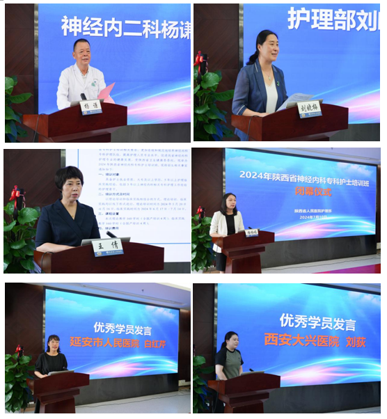 会上,基地负责人王倩总护士长从培训班前期筹备、理论教学、临床实践、教学管理、人文措施等方面进行了总结汇报。与会人员一同观看了《2024年陕西省神经内科专科护士培训班精彩剪影》。基地从理论、实践、综述、个案等多方面进行综合考核,23名学员均考核合格,顺利结业。西安大兴医院刘荻、延安市人民医院白红芹作为优秀学员代表分别发表了学习感言,表示学习期间收获了知识,斩获了技能,获得了珍贵的友谊。感谢基地老师们的辛勤付出,更对未来护理事业发展道路有了新的思考和展望。