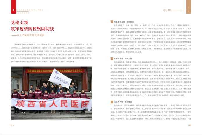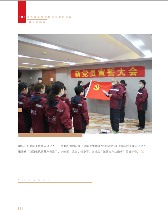 西咸院区建设;积极创建国家区域医疗中心,以国家三级公立医院绩效考核结果为导向,补齐医院运行管理短板,提升医院信息化建设,不断创新运行绩效机制;大力提倡“以职工为核心、以病人为中心”的双心文化理念,职工和患者满意度显著提升。在疫情防控阻击战中,带领各级基层党组织和广大党员,充分发挥战斗堡垒作用和先锋模范作用,圆满完成抗疫任务。党的思想、组织、作风、反腐倡廉和制度建设取得了显著成效。