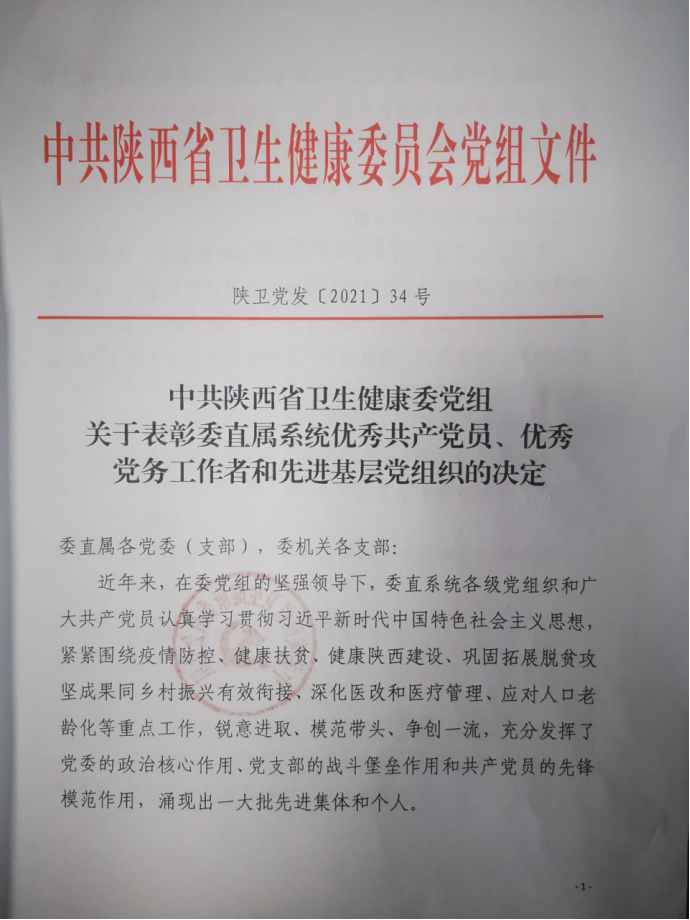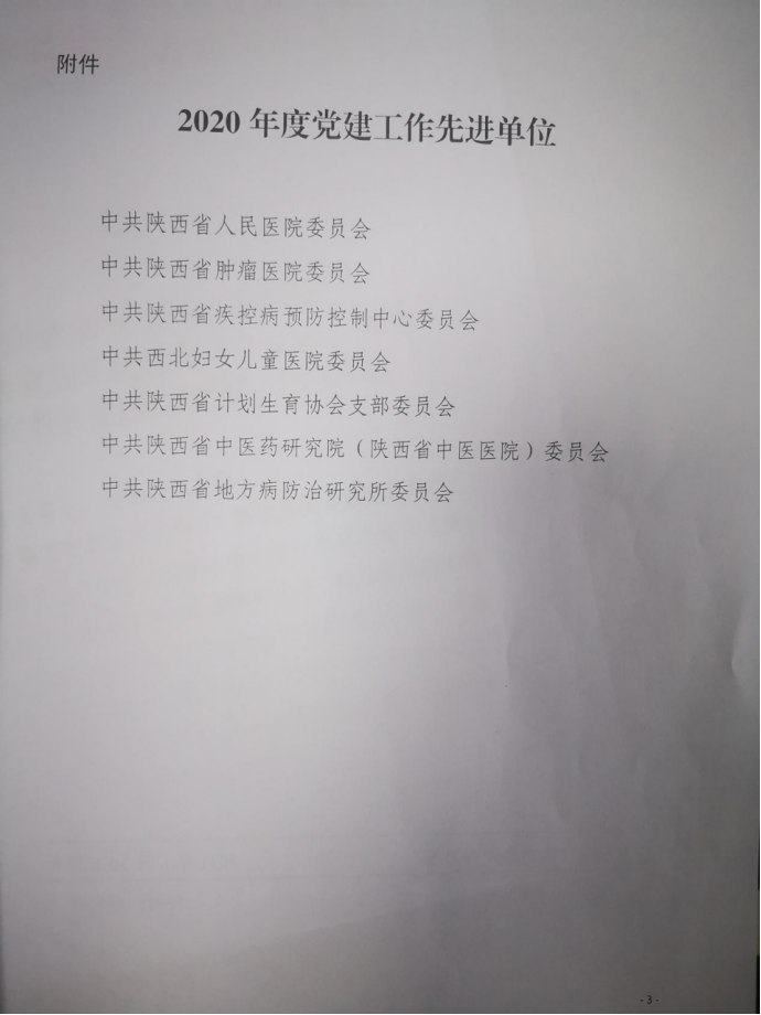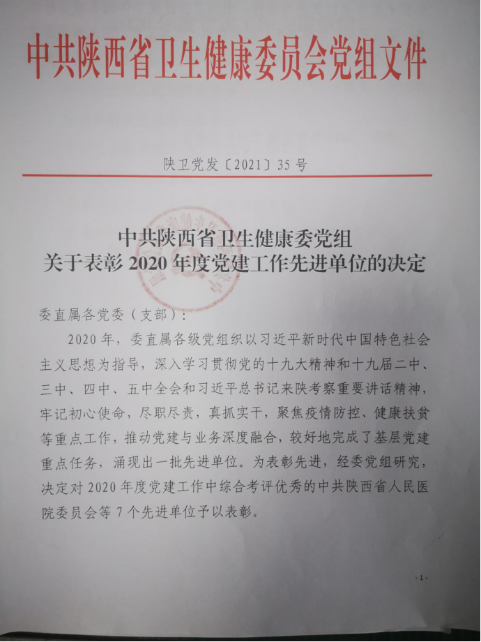 2021年2月26日,高敬龙书记代表党委,参加省卫健委2020年度基层党组织书记抓党建工作述职评议考核工作会并进行党建工作汇报,以考核第一名的成绩获得省卫健委党组表彰,并荣获“2020年度党建工作先进单位”,医院有关党建先进经验入选省委组织部编印的《陕西省基层党建优秀案例选编》。