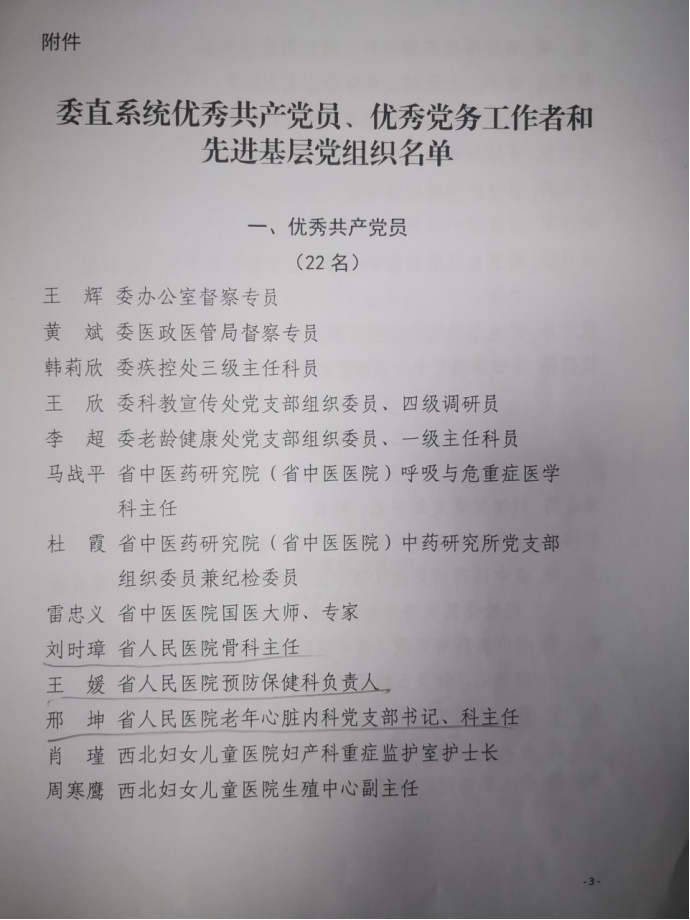 获得“2020年度党建工作先进单位”,刘时璋、王媛、邢坤获得“优秀共产党员”,白宁、党星波、李作彬获得“优秀党务工作者”,神内二科党支部、烧伤整形医学美容外科获得“先进基层党组织”荣誉称号。