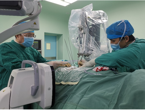在刘时璋主任精心筹备、悉心安排下,术前手术医生团队和手术机器人技术保障团队密切协作,详细分析了患者腰椎CT资料,精确规划了椎弓根螺钉通道位置及各项参数,重建模拟椎弓根螺钉植入后三维图像,并不断优化方案使其更精准、安全,并进行了手术机器人使用的术前演练。手术当天,常彦海主任医师和陈明副主任医师共同为患者实施了手术。术中,借助C臂获取患者腰椎正侧位影像及标记定位,将其传入机器人系统与患者术前腰椎CT质料匹配映射,确定了每个螺钉的实际穿刺通道,通过机械臂在压力监测和光学追踪引导下依次钻入导针,最后精准植入6枚椎弓根螺钉。脊柱周围毗邻重要神经和血管,椎弓根螺钉通道空间有限,常规经皮植钉技术风险大,容易发生神经损伤等并发症,且术中需要反复透视,手术机器人很好弥补了这些弊端,相当医生有了“透视眼”和“第三只手”,使手术操作更加智能化、精准化。