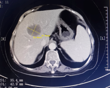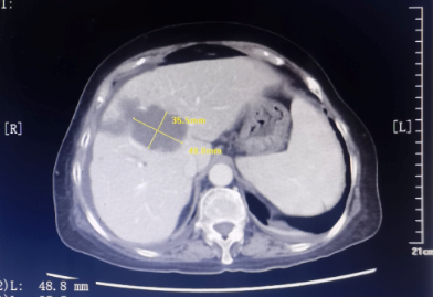 患者为67岁女性,1年余前诊断胃腺癌晚期,肝脏、骨骼及淋巴结多发转移,本次入院复查发现肝脏病灶进展,科主任白俊主任医师、主管医生刘莹主治医师详细分析并与患者家属沟通病情,考虑患者既往接受多线系统性抗肿瘤药物治疗,且治疗过程中多次出现剂量限制性骨髓毒性,继续更换药物治疗的选择空间不多,推荐超声引导下微波消融部分肝脏转移病灶,以期为后续继续免疫及靶向治疗创造在体瘤苗的机会。段宝军副主任医师认真阅片后,考虑该例患者肝转移病灶大(最大径超过5厘米),且毗邻膈肌、肝左静脉及第一肝门等重要结构,因此采用3D可视化手术规划系统设计微波消融方案,在麻醉科常建华副主任医师及手术室的精心配合下,顺利完成了肝转移病灶微波消融手术。