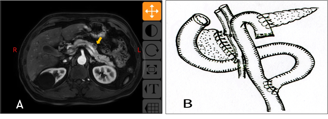 图A术前上腹部增强MRI提示胰腺导管内乳头状粘液瘤(IPMN)