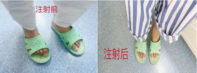 患者为81岁高龄女性,帕金森病史10年,现口服多种抗帕金森病药物,虽然生活基本可以自理,但足部的疼痛及姿势异常,严重影响了生活质量,并加重了运动症状。康蓓副主任医师、袁丹住院医师、姜珊规培医师对患者的运动症状及非运动症状进行了详细系统的评估,根据指南推荐:肉毒毒素治疗下肢肌张力障碍如足部痉挛,有助于改善症状,不良反应较少。跟患者及家属充分沟通后,决定采用A型肉毒毒素局部注射治疗方案缓解足部痉挛症状,并于5月23日进行。肉毒毒素治疗后,通常1-2周逐渐起效,现患者夜间足部疼痛及痉挛症状已得到改善,患者对治疗十分满意。