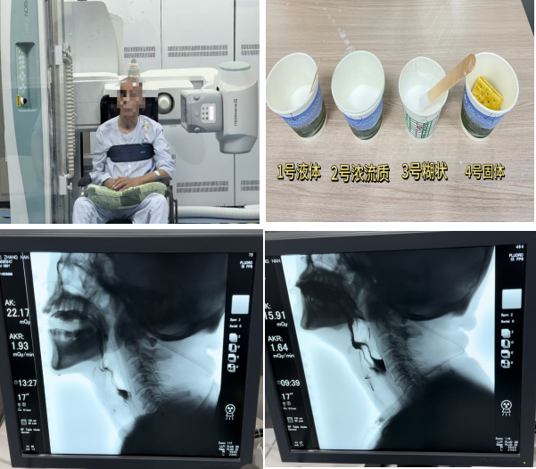 神经内科(西咸)就诊。因患者有强烈进口进食诉求,神经内科遂请康复医学科会诊。康复医学科医生及治疗师团队结合患者病历、详细问诊及吞咽检查后,考虑患者存在吞咽障碍,为进一步明确诊断,在放射科马少君副主任的支持下,康复医学科为患者进行了吞咽造影检查。检查通过在X线透视下,动态观察患者在不同体位下,分次给患者喂食不同稠度、不同剂量的食物,观察患者在吞咽中的全过程。最终,在康复医学科(西咸)魏蓉康复治疗师、吉利华副护士长、张妮国家级吞咽专科护士,放射科马少君副主任,神经内科(西咸)李舒扬护士的通力协作下,检查顺利完成,并为患者制订了详细的治疗方案。