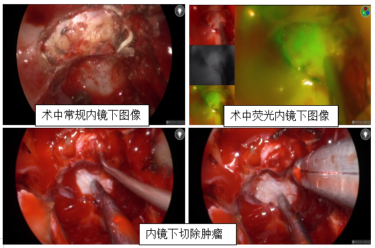 后经3T鞍区磁共振检查,岩下窦采血等多种手段发现垂体左侧份似有异常强化影,考虑垂体微腺瘤可疑。经进一步检查及多学科会诊讨论:患者诊断垂体微腺瘤(ACTH型),因肿瘤位于垂体内部偏左,直径仅有6mm大小,常规手术中肿瘤寻找及定位困难。经科室术前讨论决定利用荧光内镜辅助常规内镜经鼻蝶入路寻找并精准定位切除肿瘤。手术开始利用常规内镜充分解剖暴露垂体组织,可见在正常垂体组织表面无肿瘤征象,进一步为患者注射吲哚青绿后利用荧光内镜观察,可见垂体左下份有异常荧光染色,精确定位肿瘤后,切开垂体显露肿瘤,荧光内镜下肿瘤凸显淡绿色,清晰描绘出边际和形态,从而区别于正常垂体组织。术者边观察边切除肿瘤,做到了在精准切除肿瘤的同时,较好地保护正常垂体。经过近1小时的内镜下操作,顺利全部切除肿瘤组织。术后复查ACTH迅速下降,术后经过垂体瘤MDT团队及时调整补充激素,预防ACTH迅速下降所致症状,患者平稳度过围手术期神经内分泌改变,现已顺利出院,患者及家属均非常满意。