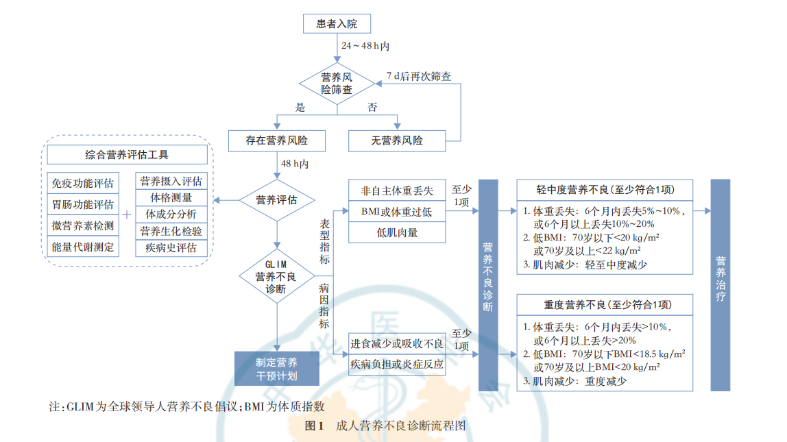 综合营养评估是结合营养相关病史、体格检查以及营养不良相关表现进行综合分析和诊断的过程。SGA、PG-SGA、MNA、GLIM等工具均可综合评估患者的营养状态,并用于诊断营养不良,GLIM正逐步获得公认。GLIM营养不良诊断流程采用两步法。第一步为营养风险筛查,确定患者是否存在营养风险,对于筛查出有营养风险者,再进行第二步的营养不良诊断。诊断包括3个表型标准和2个病因标准,需至少符合1个表型标准和1个病因标准,即诊断为营养不良。