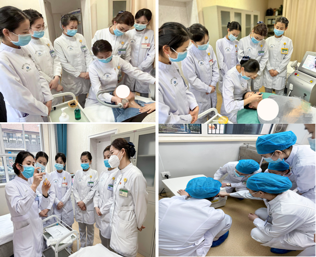 培训中,张倩护师、薛郝璇护师、娄静毓护师、白楠护师就“K-8塑雕之星”、“超冰半导体激光脱毛”、“PRP面部年轻再生化”、“德玛莎水光仪”“复合酸临床应用”进行了全面专项培训,从仪器功效、原理结构及实操手法,手把手教学分享宝贵经验,以互动提问的方式进一步提高参与的积极性,深入解决问题。培训促使高年资护士查缺补漏,日益精进,帮助低年资护士受益匪浅,尤其对新入职护士树立主人翁意识增强归属感,强化基础知识与实践技能起到了关键作用。