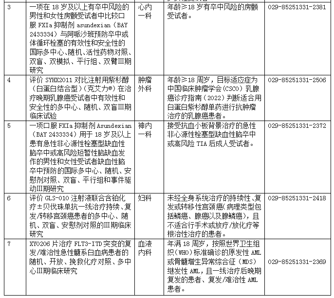 本季度欧美视频 新增开展7项药物临床试验项目,适应症涉及乳腺癌、宫颈癌、白血病、脑卒中、房颤等多种疾病。为助推项目进度,使更多的受试者在临床试验中获益,现将项目招募信息汇总如下,望有意向参加的患者来院或来电垂询。欧美视频 将严格按照GCP规范管理各临床试验项目,通过知情同意、遵循方案、信息保密、严密随访、免费检查、给予补助等多种措施充分保护受试者的安全和合法权益。