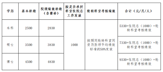 本着“同工同酬”的原则,参照同等条件的主治医师生活补助标准发放生活基本补助和绩效补助,参与科室绩效分配。具体发放办法见下表: