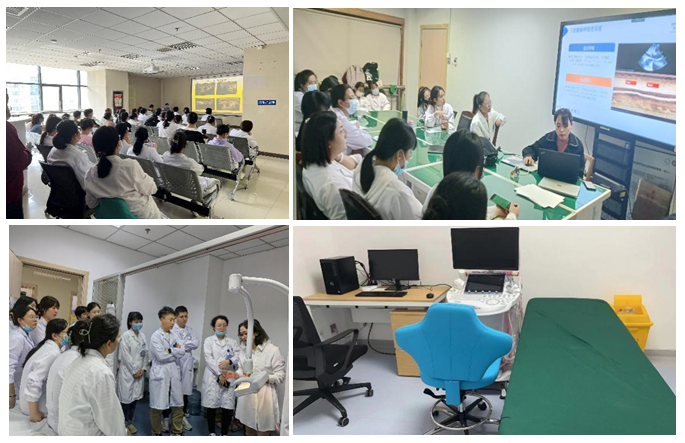 超声诊断中心同时进行了阶段性的强化学习活动,开展多种形式的培训和学习,包括科室2次乳腺容积超声集体培训,每周五中午集体指南共识学习,安排重症心肺超声线上线下集体学习等。不同专业组年轻医生在精进各自专业的同时,各位医生打破专业壁垒,利用全时间段到心脏诊室、肌骨诊室及介入诊室等,强化日常工作中的薄弱环节。针对部分亚专业,如心脏超声,科室安排老教授带教医生上机检查,提高学习效率和质量。通过科室帮助与医生自学,促使科室医护人员掌握各专业常见检查,满足西咸临床所有检查需求。